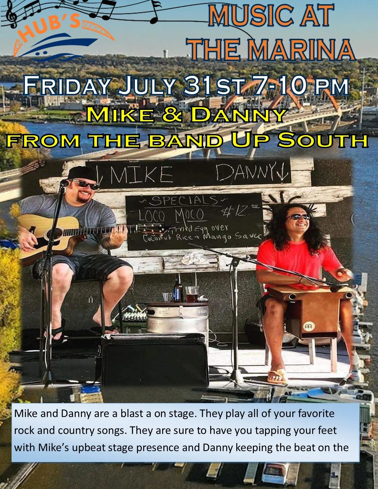 Back to All Events Mike & Danny At The Marina Friday, July 31, 2026 7:00 PM 10:00 PM Hub's Yacht Club & Marina 6 Spiral View Loop Road Hastings, MN, 55033 United States (map) Google Calendar ICS